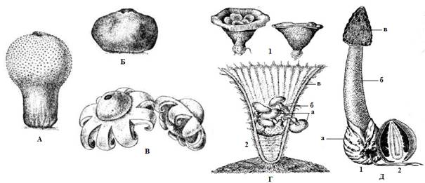 Рис. 37. Плодовые тела гастеромицетов (Gasteromycetiidae) (по: Гордеева и др., 1953, Курс низших растений, 1981). А – дождевик шиповатый (Lycoperdon perlatum), Б – бовиста или порховка (Bovista); В – земляная звездочка (Geaster); Г – бокальчик (Cyathus): 1 – внешний вид; 2 – продольный разрез плодового тела: а – перидиоли, б – шнур, в – стенка перидия; Д – веселка обыкновенная (Phallus impudicus): 1 – зрелое плодовое тело: а – перидий, б – рецептакул, в –глеба; 2 – гриб на стади яйца в разрезе