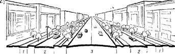 Рис.Поперечные профиля улиц: а - магистральная улица, б — магистральная улица общегородского назначения; в—улица жилого квартала; 1 — тротуар, 2 — местное движение, 3 —транзитное движение; 4 — проезжая часть, 5 — обособленное трамвайное полото