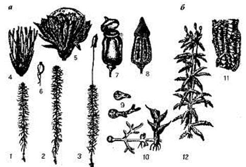 Мхи: а—кукушкин лен; б—сфагнум; I —женское растение; 2 — мужское растение; 3 — женское растение со спорогоном; 4 — верхушка женского растения с архегониями (а); 5 — верхушка мужского растения с антеридиями (6); б — сперматозоид; 7— спорогон; 8 — спорогон на продольном разрезе; 9 — прорастание спор; 10 — протонема и основание стебелька; 11 — ассимилирующие и мертвые водоносные клетки сфагнума; 12 — общий вид сфагнума. Внутри коробочки спорогона размещается спорангий, в котором образуются гаплоидные споры. После созревания споры высыпаются из коробочки, разносятся ветром и в благоприятных условиях прорастают, образуя протонему в виде зеленой разветвленной нити. На ней закладываются почки, из которых со временем развиваются листостебельные растения мха. Зеленые мхи способны также к вегетативному размножению молодыми побегами, почками, листьями, выводковыми телами. Сфагновые мхи. К сфагновым (белым, или торфяным, мхам) относится примерно 350 видов, составляющих один род сфагнум. Они распространены по всему миру, но наиболее обильно представлены на верховых болотах, где господствуют над всеми остальными видами растений. Строение сфагновых мхов отличается рядом особенностей. У них отсутствуют ризоиды, поэтому вода с растворенными минеральными солями поступает непосредственно в клетки листа и стебля. Стебель гаметофита несет мутовки ветвей, густо покрытых листьями, которые на верхушке главной оси образуют розетку в виде головки почковидной формы. Некоторые боковые, более длинные веточки свешиваются вдоль стебля и плотно прилегают к нему, создавая своеобразную проводящую систему наподобие фитиля, по которому поднимается вода. Листья сфагновых мхов не имеют средней жилки. Все они состоят из двух типов клеток: живых — ассимилирующих, длинных и узких, с хлоропластами, и мертвых (без протопласта), с утолщениями на стенках и порами. Подобные клетки без живого содержимого присутствуют и в стебле. Благодаря такому анатомическому строению стебля и листа сфагнум способен впитывать и удерживать большое количество воды, которая в 30— 40 раз превышает массу самого растения. Поэтому почва, где поселяются эти мхи, постепенно переувлажняется и заболачивается. Антеридии и архегонии сфагнумов образуются либо на разных особях, либо на разных веточках одного и того же растения. После оплодотворения из зиготы формируется шаровидная коробочка на ложноножке, являющейся частью гаметофита. При вскрытии коробочки зрелые споры разлетаются на расстояние до 10 см и прорастают, образуя пластинчатую протонему с ризоидом. Из почки на протонеме вырастает гаметофит. Особенностью сфагновых мхов является беспрерывное нарастание стебля верхушкой и отмирание нижней части. Однако полного сгнивания отмерших частей не происходит, так как в пере-увлажненной почве мало кислорода, а вследствие выделения сфагнумом специфических органических кислот создается кислая среда, в которой прекращается развитие почвенных микроорганизмов (бактерий, грибов и др.), разлагающих растительные остатки. В течение длительного времени происходит накопление значительных запасов органических веществ в виде торфа. Процесс образования торфа идет очень медленно: слой торфа в 1 см накапливается за 10 лет, толщиной в 1 м — за тысячу лет. В Беларуси болота занимают площадь около 2, 5 млн. га 