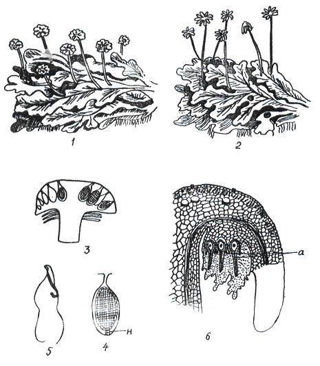 Рис. 11. 1. Цикл воспроизведения маршанции: 1 – таллом с мужскими подставками; 2 – таллом с женскими подставками; 3 – вертикальный разрез через мужскую подставку (в некоторых антеридиальных полостях находятся антеридии); 4 – антеридий в антеридиальной полости (н – ножка антеридия); 5 – двужгутиковый сперматозоид; 6 – вертикальный разрез через женскую подставку (а – архегоний). Гаметофит имеет темно-зеленое слоевище (таллом), дихотомически разветвленное на широкие лопастные пластинки с дорсовентральной (спинно-брюшной) симметрией. Сверху и снизу слоевище покрыто эпидермой, внутри имеются ассимиляционная ткань и клетки, выполняющие проводящую и запасающую функции. К субстрату слоевище прикрепляется ризоидами. На верхней стороне слоевища в особых «корзиночках» образуются выводковые почки, служащие для вегетативного размножения. Талломы раздельнополые, органы полового размножения развиваются на особых вертикальных ветвях-подставках. Мужские гаметофиты имеют восьмилопастные подставки, на верхней стороне которых находятся антеридии. На женских гаметофитах подставки со звездчатыми дисками, на нижней стороне лучей звездочки расположены (шейкой вниз) архегонии. При наличии воды сперматозоиды перемещаются, попадают в архегоний и сливаются с яйцеклеткой. После оплодотворения из зиготы развивается спорогон. Он имеет вид шаровидной коробочки на короткой ножке. Внутри коробочки, в результате мейоза, из спорогенной ткани, образуются споры. В благоприятных условиях споры прорастают, из них развивается протонема в виде небольшой нити, из верхушечной клетки которой развивается таллом маршанции.