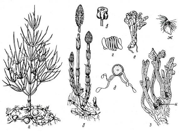 Рис. 11. 6. Хвощ полевой: а, б – вегетативный и спороносный побеги спорофита; в – спорангиофор со спорангиями; г, д – споры; е – мужской гаметофит с антеридиями; ж – сперматозоид; з – обоеполый гаметофит; и - архегонии.