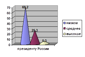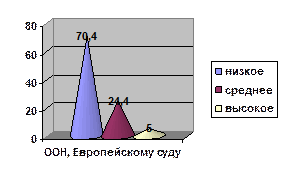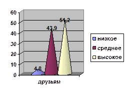 По уровню доверия, высокий уровень доверия наблюдается к близкому социальному окружению: семье и друзьям (77, 5% и 51, 2% соответственно). В лидерах по низкому уровню доверия значимые органы власти на местном и федеральном уровнях: на первом месте - региональная власть (82, 3%), на втором - городская власть (81, 3%), на третьем – федеральная власть (77%), на четвертом – Президент России (69, 2%), на пятом – ООН и Европейский суд по правам человека (70, 4%). Следует отметить, что уровень доверия к церкви довольно низок – 55%. Результаты представлены в диаграммах (подробнее см. Приложение, таб. 15 - 24). Оценка уровня доверия молодежи к социальному окружению (в % от общего числа)