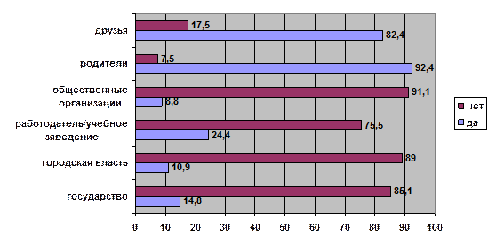 На вопрос «Ощущаете ли Вы заботу о себе со стороны государства, городской власти, работодателя/учебного заведения, общественной организации, родителей, друзей?» ответы распределились следующим образом: - молодежь ощущает заботу со стороны родителей (92%) и друзей (82%); - не ощущает со стороны общественных организаций (91%), городской власти (89%), государства (85%) и работодателя/учебного заведения (75%). Существующая дистанция ощущается молодежью всех возрастных групп в равной степени (подробнее см. Приложение, таб. 57 – 62). Оценка деятельности социальных объектов по отношению к молодежи (в % от общего числа)