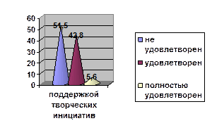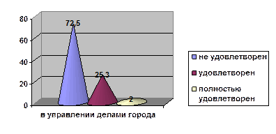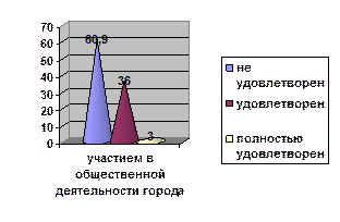5. Удовлетворенность своими возможностями в городе (в % от общего числа) На вопрос: «Насколько Вы удовлетворены своими возможностями в городе?», ответы распределились следующим образом: - не удовлетворены в управлении делами в городе (72%), решением жилищных проблем (70%), трудоустройством (65%), участием в общественной деятельности города (60%), поддержкой творческих инициатив (56%) (подробнее см. Приложение, таб. 25 – 35).