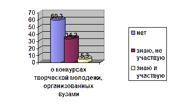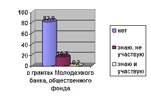 8. Информированность о формах поддержки молодежи (в % от общего числа) На вопрос: «О каких формах поддержки молодежи Вы информированы?», ответы распределились следующим образом: - активное участие молодежь принимает в центре занятости населения (10%) и конкурсах творческой молодежи, организованных вузами (5%); - не информированы о грантах о поддержке фонда «С.О.К.» (89%), Молодежного банка и общественных фондах (82%), о средствах национальных проектов (82%), о городских грантах и конкурсах (74%) (подробнее см. Приложение, таб. 65-71).