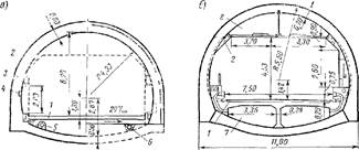 При пересечении коротких и крутых выходов скал на участках трассирования дорог долинным ходом, а также на высокогорных перевальных участках, подверженных снежным заносам, целесообразно прокладывать трассу тоннелями. При высокой стоимости и сложности строительства тоннельные варианты обеспечивают значительное улучшение условий последующей эксплуатации дороги. На перевальных участках сравнивают несколько вариантов с различным положением тоннеля по высоте. Вход в тоннель обычно располагают в выемке. Переход от выемки к тоннелю назначают при глубине выемки, соответствующей по строительной и эксплуатационной стоимости 1 м тоннеля. Считается, что при разработке выемок методом взрыва на выброс целесообразно переходить к тоннелю при глубине 20—35 м в зависимости от принятого сечения и длины тоннеля, геологических и гидрогеологических условий. Ширину проезжей части в тоннеле между бортовыми камнями назначают 7—8 м, устраивая с одной стороны тротуар шириной I м. Если количество пешеходов превышает 1000 чел/ч, тротуары устраивают с двух сторон. Высоту тоннеля назначают из условия обеспечения того же габарита, как и на мостах с ездой понизу, с дополнительным устройством в случае необходимости каналов для вентиляции (рис.). Тоннели проектируют для двух полос движения. На дорогах I категории допускается устройство тоннелей для четырех полосного движения и двухъярусных тоннелей с двухполосным движением в каждом ярусе. Сопротивление движению автомобиля в тоннелях возрастает го сравнению с открытыми участками дороги из-за дополнительного сжатия воздуха перед автомобилем («эффект поршня») и турбулентности воздушного потока между движущимся автомобилем и стенами тоннеля. При длине тоннеля около 1 км сопротивление воздуха для грузовых автомобилей увеличивается примерно на 40%, для легковых на 10%. В плане и продольном профиле тоннели проектируют по тем же нормам, что и открытые участки автомобильных дорог, отдавая предпочтение расположению тоннелей на прямых участках. Радиусы кривых в плане в тоннелях должны быть не менее 250 м, что необходимо для обеспечения минимальных требований к видимости. Продольный уклон в тоннелях должен быть не менее 4°/00 (для обеспечения водоотвода) и не более 40°/00. При длине тоннеля до 500 м в исключительных случаях уклон может быть увеличен до 60°/00. Тоннелям длиной до 300 м придают односторонний уклон. Свыше 300 м рекомендуется двускашый уклон с подъемом к середине тоннеля. В стенах тоннелей устраивают камеры для храпения материалов и инструментов шириной 2 м, глубиной 2 м и высотой 2, 5 м, которые размещают в шахматном порядке через 300 м с каждой стороны тоннеля. При длине тоннеля 300—400 м предусматривают одну камеру в середине тоннеля. В тоннелях длиной более 150 м должна быть оборудована искусственная вентиляция. При меньшей длине тоннеля считают, что смена воздуха обеспечивается за счет движения автомобилей. Вентиляция в тоннелях должна обеспечивать также удаление отработавших газов автомобилей с дизельными двигателями, затрудняющих видимость. В связи с широким применением этилированных бензинов, продукты сгорания которых, кроме окиси углерода, содержат и другие вредные примеси, к очистке воздуха в тоннелях предъявляют столь же высокие требования, как и на промышленных предприятиях, Скорость движения воз