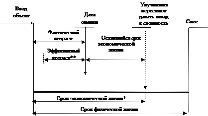 Рис. 1.1. Сущностные характеристики объектов недвижимости Жизненный цикл объекта недвижимости как физического объекта – это последовательность процессов существования объекта недвижимости от замысла до ликвидации (утилизации). Стадии жизненного цикла объекта недвижимости: предпроектная – проектная – строительство – эксплуатация – закрытие. Жизненный цикл объекта недвижимости включает срок экономической и физической жизни (рис. 1.2). Все объекты недвижимости (кроме земли при нормальном ее использовании) подвержены износу. Износ – потеря полезных свойств и уменьшение стоимости недвижимого имущества по любым причинам. В зависимости от факторов снижения стоимости недвижимости износ подразделяется на физический, функциональный и внешний (экономический). Физический износ отражает изменения физических свойств объекта недвижимости со временем по естественным причинам или вследствие неправильной эксплуатации (нормальный и индивидуальный физический износ). Функциональный износ заключается в том, что объект не соответствует современным стандартам с точки зрения его функциональной полезности. Внешний (экономический) износ – снижение стоимости объекта недвижимости вследствие негативного изменения его внешней среды, обусловленного экономическими, политическими или другими факторами. Физический и функциональный износ могут иметь устранимый и неустранимый характер, внешний износ всегда характеризуется как неустранимый. Накопленный износ по совокупности всех его типов в той или иной мере зависит от срока жизни объекта недвижимости (рис. 1.2).