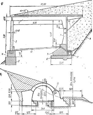 Рис. Схемы противолавинных галерей а — балочная консольная, б — арочная; 1 — стойка верховой опоры, 2 — железобетонная балка; 3 — вертикальная или наклонная стойка; 4 — горизонтальная опорная балка; 5 — фундаментная подушка; 6 —фундаментная плита; 7 — фундамент верховых опор; 8 — засыпка; 9 — дренажный лоток; 10 — мощение; 11— бетонное покрытие; 12 — тощий бетон