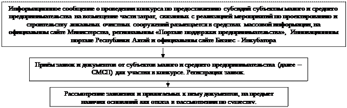 3.2.1.Основанием для приема заявлений на оказание государственной поддержки является доведение Министерством финансов Республики Алтай бюджетных ассигнований на соответствующий год до Министерства, в рамках реализации республиканской целевой программы «Развитие малого и среднего предпринимательства в Республике Алтай на 2011 – 2014 годы», утвержденной постановлением Правительства Республики Алтай от 19 августа 2010 года № 183, по мероприятию «Предоставление субсидий на возмещение части затрат субъектов малого и среднего предпринимательства, связанных с реализацией мероприятий по проектированию и строительству локальных очистных сооружений». 3.2.2. Министерство размещает информацию о проведении конкурса в республиканских средствах массовой информации, на официальном сайте Министерства в сети Интернет, региональном «Портале поддержки предпринимательства», Инновационном портале Республики Алтай и сайте Бизнес – Инкубатора. 3.2.3. Субсидии предоставляются Министерством на конкурсной основе в соответствии с условиями Порядка.