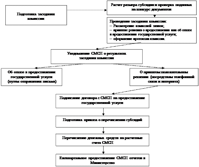 3.1.1. Предоставление государственной услуги включает в себя последовательное выполнение следующих административных процедур: 1) объявление конкурса на предоставление субсидий; 2) прием и регистрация заявления и прилагаемых к нему документов для участия в конкурсном отборе; 3) рассмотрение заявления и прилагаемых к нему документов на предмет наличия оснований для отказа в рассмотрении по существу; 4) подготовка и проведение заседания комиссии по вопросу предоставления государственной услуги; 5) уведомление субъектов предпринимательства о результатах заседания комиссии; 6) подписание договора с субъектом предпринимательства на предоставление государственной услуги; 7) перечисление субсидий на расчетные счета субъектов предпринимательства.