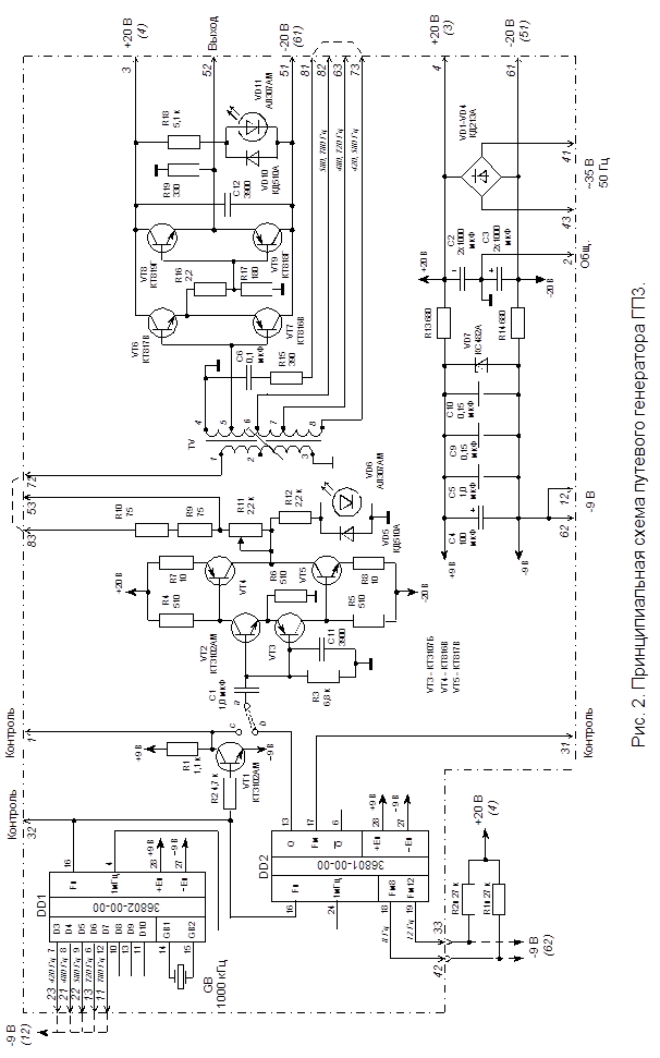 малое входное сопротивление практически не влияет на ширину полосы пропускания. Транзисторы оконечного усилителя мощности VT6 – VT9 включены по схеме с общим коллектором и работают в линейном режиме. Так как сопротивление резистора R16 мало (2, 2 Ом), каждая пара транзисторов VT6, VT8 и VT7, VT9 представляет собой составной транзистор с большим коэффициентом передачи тока. Такое включение увеличивает входное сопротивление усилителя, т. е. уменьшает его влияние на полосу пропускания фильтра, и позволяет при небольшом числе компонентов схемы получить выходную мощность ПУ3 до 20 ВА на нагрузке 7 Ом. Поскольку при максимальном уровне сигнала выходные транзисторы VT8 и VT9 не могут перейти в режим насыщения, схема становится малокритичной к величинам коэффициентов передачи тока, т. е. её температурная стабильность повышается. Питание ±20 В к оконечному усилителю мощности подключается внешними перемычками 3 – 4 и 51 – 61. Выходной сигнал снимается с выводов 52 и 2. Для визуального контроля работы каскадов к их выходам подключены светодиоды VD6 и VD11. Ровное свечение VD11 свидетельствует о наличии питания на оконечном усилителе, а мигание обоих светодиодов с частотой манипуляции говорит о нормальной работе схемы. Генератор ГП3 питается от внешнего источника переменного тока частотой 50 Гц с номинальным напряжением 35 В, которое подаётся на выводы 41 – 43. Допустимые пределы изменения питающего напряжения от 31, 5 до 36, 8 В. Мостовой выпрямитель VD1 – VD4 с конденсаторами фильтра обеспечивает постоянное напряжение ±20 В для питания предварительного и оконечного усилителей мощности. Напряжение ±9 В для питания микросборок и буферного каскада на транзисторе VT1 создаётся параметрическим стабилизатором VD7, R13 и R14 с конденсаторным фильтром С4, С5, С9 и С10. На плате генератора имеются технологические контакты a, b и с. При установке перемычки между а и b на выход усилителя поступает частотно-манипулированный сигнал, соответствующий настройкам генераторов несущей и манипулирующей частоты. Если перемычка установлена между контактами a и c, то на выходе усилителя будет непрерывный сигнал несущей частоты. Ручка регулятора выходного напряжения R11 и светодиоды размещены на передней панели кожуха генератора. Схема и элементы генератора ГПЗ размещены в корпусе, реле НШ. При эксплуатации он устанавливается на рамах стативов или шкафов в соответствующие розетки. Путевой генератор ГП3 выпускается в двух модификациях – ГП3/8, 9, 11 и ГП3/11, 14, 15, которые предназначены для формирования частотно-манипулированных сигналов с несущими частотами 420, 480, 580 и 580, 720, 780 Гц соответственно и частотами манипуляции 8 или 12 Гц. Модификации отличаются параметрами устанавливаемого трансформатора TV.