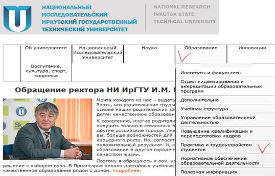 Рисунок 1. Расположение на web.сайте университета странички Отдела практик и СТС ИрГТУ