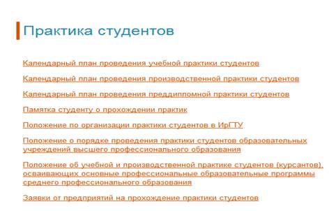 В разделе - Практика студентов студенты могут посмотреть календарные планы, в которых обозначены начало и окончание практики по всем видам - учебная, производственная и преддипломная; скачать анкеты предприятий. Познакомиться с Положением «По организации практики студентов в ИрГТУ» по ВПО и СПО; с информационным материалом «Памятка студенту о прохождении практики»; с заявками предприятий на студентов для прохождения производственных и преддипломных практик (рис. 2).