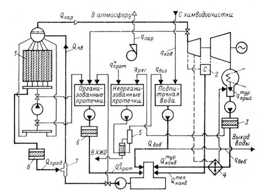 Поступающая в реакторный контур вода после деаэратора называется питательной и обозначается Вода реакторного контура очищается продувкой – В идеальном случае при отсутствии потерь воды и пара сумма всех перечисленных потоков должна равняться расходу питательной воды. Однако в цикле станции существуют потери, которые должна восполняться добавочной водой