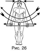 Упражнение 11 " ЭНЕРГЕТИЧЕСКИЙ КОЛОКОЛ" Нижний и верхний " колокол" развивают два энергетических центра: верхний - в самом центре головы, нижний - в центре промежности. " НИЖНИЙ КОЛОКОЛ" Рис. 26 Исходное положение: Ноги на ширине плеч, колени слегка согнуты, руки обращены ладонями к району нижнего энергетического центра и слегка разведены в стороны.