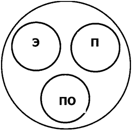 Рис. 46. Три составляющие биокомпьютера: медитация (в основе пространственная ориентация — ПО, форма голограммы); видение во сне (память — П, морфологические поля); обычное зрение (энергообмен — Э)