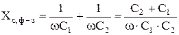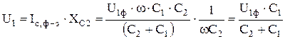Обычно ёмкости конденсаторов С1 и С2 выбираются таким образом, чтобы при номинальном фазном напряжении линии U1ф, ном напряжение на конденсаторе С2 составляло (0, 05 ÷ 0, 1) U1ф, ном. Если к конденсатору С2 подключить первичную обмотку трансформатора, то напряжение на его вторичной обмотке U2 будет пропорционально фазному напряжению линии с учётом соотношения ёмкостей С1 и С2. Ёмкостное сопротивление участка фаза-земля (рисунок 1.7) равно