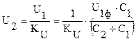 Электромагнитные измерительные ТН для высоких первичных напряжений получаются громоздкими и дорогими. Особые трудности возникают при выполнении их внутренней изоляции. Поэтому для первичных напряжений 110кВ, 150кВ, 220кВ и 330кВ измерительные ТН выполняются многоступенчатыми каскадного типа. В таких трансформаторах всё напряжение сети равномерно распределяется между двумя, - тремя отдельными каскадами. В сетях с номинальным напряжением 500кВ и выше для питания устройств РЗ применяются ёмкостные делители напряжения совместно с электромагнитными ТН. Если между фазным проводом линии электропередачи и землёй включить последовательно два конденсатора (две группы конденсаторов) С1 и С2 (рисунок 1.7), то фазное напряжение линии U 1ф распределится между конденсаторами обратнопропорционально их ёмкостям