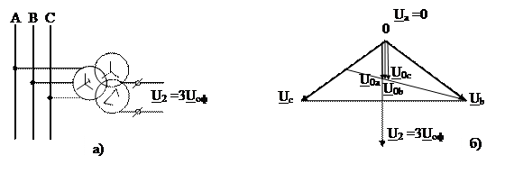 Для получения напряжений НП обычно используются однофазные (свыше 35 кВ) или трёхфазные пятистержневые (до 35 кВ) трансформаторы напряжения. Их первичные обмотки соединяются в звезду, нейтраль которой заземляется (рисунок 1.14).