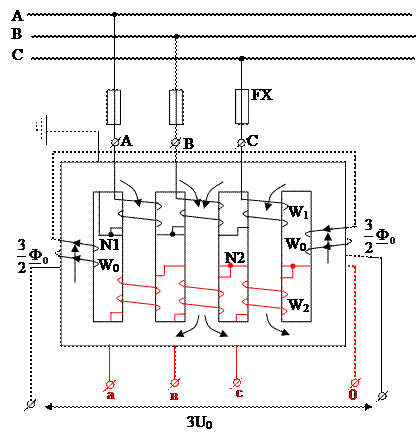 В нормальном режиме, а также при двух – и трёхфазном КЗ, когда геометрическая сумма фазных напряжений равна нулю, магнитные потоки в крайних стержнях отсутствуют. Поэтому напряжение на зажимах специальных обмоток Wо равно нулю. При однофазном КЗ или двухфазном КЗ «с землёй», когда геометрическая сумма фазных напряжений не равна нулю, в магнитопроводе помимо потоков прямой и обратной последовательностей появляются магнитные потоки НП. Магнитные потоки ПП и ОП замыкаются между тремя средними стержнями, не выходя в крайние стержни. Поэтому напряжения ПП и ОП не трансформируются в специальные обмотки. Составляющие НП возбуждают в трёх средних стержнях магнитные потоки НП, которые замыкаются через крайние стержни и наводят в специальных обмотках Wо ЭДС, пропорциональные напряжениям НП в первичных цепях.