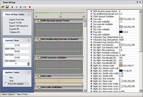 Редактор времени суток, несмотря на свою название, имеет в себе гораздо больше функций, кроме, собственно, изменения времени суток и включает в себя различные установки: положение солнца, настройки цвета неба, настройки тумана, настройки течения времени, освещения и многое другое.