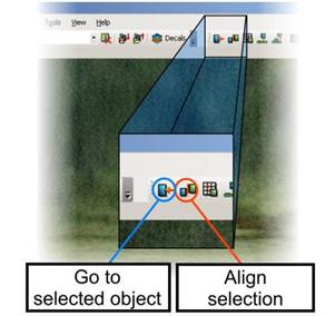 Для использования функции " перейти к выбранному объекту" (go to selected object), выберите нужный вам объект, и нажмите на иконку, изображенную ниже, камера переместится к объекту, который вы выбрали. Для использования функции " совместить объекты" (align selection), выберете объект, нажмите кнопку " совместить объекты" (align selection), затем выберете объект с которым хотите совместить. Все преобразования (положение, вращение, масштабирование) будут скопированы из выбранного объекта.