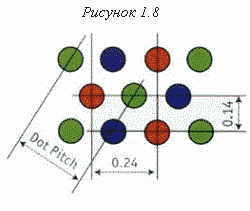 Недостатки теневой маски хорошо известны: во-первых, это малое соотношение пропускаемых и задерживаемых маской электронов (только около 20-30% проходит через маску), что требует применения люминофоров с большой светоотдачей, а это в свою очередь ухудшает монохромность свечения, уменьшая диапазон цветопередачи, а во-вторых, обеспечить точное совпадение трех не лежащих в одной плоскости лучей при отклонении их на большие углы довольно трудно. Теневая маска применяется в большинстве современных мониторов - Hitachi, Panasonic, Samsung, Daewoo, LG, Nokia, ViewSonic. Минимальное расстояние между люминофорными элементами одинакового цвета в соседних строках называется шагом точек (dot pitch) и является индексом качества изображения [см. рис. 1.8]. Шаг точек обычно измеряется в миллиметрах (мм). Чем меньше значение шага точек, тем выше качество воспроизводимого на мониторе изображения. Расстояние между двумя соседними точками по горизонтали равно шагу тачек, умноженному на 0, 866.