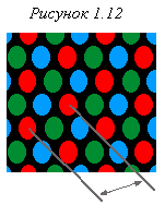 Также в 1997г. компанией Hitachi - крупнейшим проектировщиком и изготовителем ЭЛТ - была разработана EDP - новейшая технология теневой маски. В типичной теневой маске триады размещены более или менее равносторонне, создавая треугольные группы, которые распределены равномерно поперек внутренней поверхности трубки [см. рис. 1.12]. Компания Hitachi уменьшила расстояние между элементами триады по горизонтали, тем самым, создав триады, более близкие по форме к равнобедренному треугольнику. Для избежания промежутков между триадами сами точки были удлинены, и представляют собой скорее овалы, чем круг.