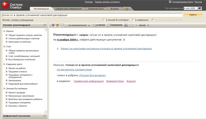 Например, нужно узнать, может ли налоговая инспекция отказать в приеме уточненной налоговой декларации. Чем подробнее сформулирован запрос, тем конкретнее будут полученные данные.Так, по запросу «уточненная налоговая декларация» поисковая система предложит более 55 ссылок на экспертные материалы. По запросу «отказ в приеме уточненной налоговой декларации» Система выдаст одну ли несколько ссылок, первая из которых будет содержать все необходимые сведения.