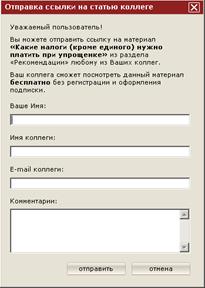 Каждому клиенту предлагается ввести в диалоговое окно: свое имя, имя коллеги, e-mail коллеги и свои комментарии. Далее нужно нажать кнопку Отправить. Коллега сможет посмотреть этот материал бесплатно без оформления регистрации и оплаты доступа!