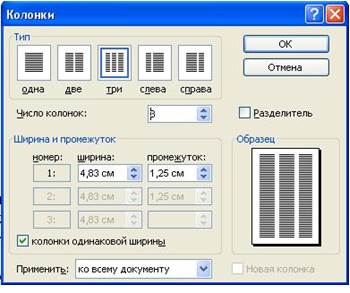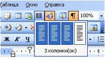 В таких документах, как газеты или бюллетени, текст обычно размещается в колонках. ВWord, чтобы создать колонки, достаточно выделить нужный фрагмент текста и указать число колонок, воспользовавшись кнопкой
