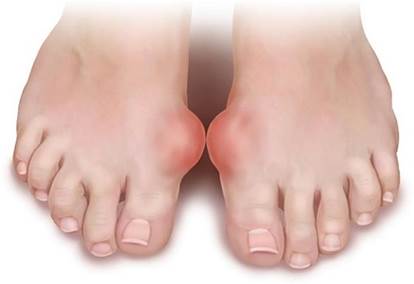 Изменения в суставе вызваны накоплением кристаллов мочевой кислоты Проявления беспокоят больного ночью или утром после пробуждения и подъема с кровати. Один из главных симптомов – наличие быстро нарастающей боли в области поражения. Помимо этого болевой синдром сочетается с припухлостью больного сустава, гиперемией(покраснением) и гипертермией(сустав горячий на ощупь). К пораженному суставу невозможно прикоснуться, любая попытка пошевелить им причиняет больному сильную боль. Первичное поражение в основном начинается с большого пальца на нижних конечностях (олигоартрит). Но как показывает статистика, это больше характерно для мужчин, у женщин подагрический артрит сначала поражает суставы кистей, вызывая олиго- или полиартриты. Первые проявления нередко сопровождаются лейкоцитозом, лихорадкой и т. п., что маскирует подагру под инфекционную патологию. Подагрическая атака при легком течении длится не больше 1-2 суток, но при тяжелой степени болезни может затянуться на неделю и больше. Отличительной чертой начальной стадии является полное исчезновение всех симптомов болезни даже без терапевтического вмешательства. Рецидивирующий подагрический артрит Первый межприступный период может длиться от 1 до 2 лет, крайне редко (7%) затягиваясь до 10 лет. Впоследствии перерывы будут значительно короче. Симптомы заболевания тоже будут только усиливаться. В процесс начнут вовлекаться здоровые суставы. Не исключено наличие полиартикулярного заболевания с мигрирующим характером. В пораженных суставах воспалительный процесс разрастается, передаваясь в периартикулярные ткани (суставная сумка и связки). Можно обнаружить единичные узлы (тофусы), которые образуются при активном оседании в суставах солей. На этой стадии они еле заметны и при пальпации, как правило, безболезненны. Хроническая тофусная подагра О наличии хронического заболевания можно говорить при появлении первого рецидива. В течение разного времени тофусы развиваются у половины больных подагрой. Длительность этих промежутков зависит от характера лечения, уровня гиперурикемии и степени тяжести поражения почек. Тофусы могут локализоваться подкожно или снаружи в различных областях: ñ ñ на локтях; ñ на коленных суставах; ñ на ушных раковинах; ñ на внутренних органах и т. д. В запущенных случаях на поверхности тофусов могут появляться образования, из которых периодически выделяется пастообразное вещество. Как правило, тофусы появляются при частых рецидивах заболевания, более раннее формирование узлов может быть в следующих случаях: ñ при ювенильной подагре; ñ у женщин пожилого возраста, злоупотребляющих диуретиками; ñ при нарушении функции почек; ñ при некоторых миелопролиферативных патологиях. Лечение подагрического артрита Все методы борьбы с подагрой условно можно разделить на 2 вида: медикаментозное лечение и терапия без использования лекарственных препаратов. Медикаментозное лечение основано на следующих принципах. 1.Экстренное купирование приступа подагры. 2.Правильный подбор препаратов с целью предупреждения развития рецидива и осложнений (поражение почек, образование тофусов и деструктивные изменения поверхностей суставов). 3.Диагностирование и лечение сопутствующих болезней суставов. Лечение заболевания должно начинаться сразу же при его выявлен