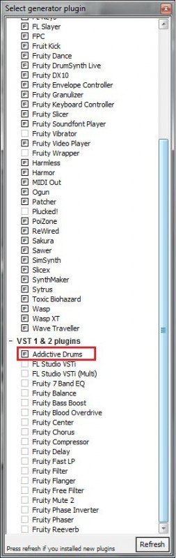Сейчас я покажу, как подключить и использовать плагин Addictive Drums. Точно таким же образом вы можете использовать любой другой VST-плагин. Итак… 1. Скачиваем и устанавливаем Addictive Drums 2. В программе Fruity Loops выбираем Сhannel -> Add one -> More… откроется окно доступных плагинов.