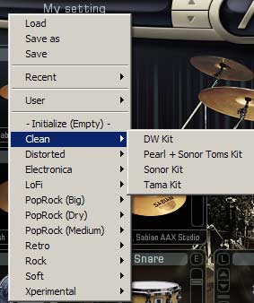 Нижняя часть на всех вкладках представлена 8-ми канальным микшерским пультом с ползунками уровней и понятными кнопками – всё стандартно. +1 стерео канал – оверхэды (два микрофона по краям над установкой), а так же регулятор уровня эффекта объёма, (комната-зал) регулятор уровня «шины» (уровня «просачивания» эффекта в канал инструмента) и Мастер-регулятор – уровень общего «выхода». Вкладка Edit: