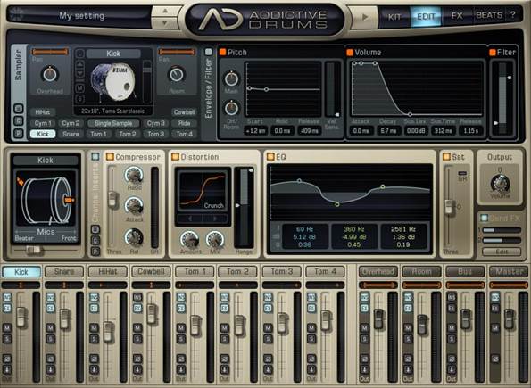 VST и RTAS плагин (plug-in) виртуальная drum-машина (барабанная установка) или синтезатор ударных инструментов последнего поколения Addictive Drums. Детище фирмы Xlnaudio. Тут сразу просится пара эмоций: Притом, что программа гибка в настройке и выборе звуков для достижения различных стилей, проста в управлении, интуитивно понятна даже при лёгком с ней флирте, а при тесном приближении, и дальше не строит из себя “девочку” – это ещё и программа на редкость с очень убедительным звучанием барабанов… При включении plug-in’а предстаёт интерфейс с виртуальной барабанной установкой, при нажатой вкладке “Kit”, как на картинке ниже: