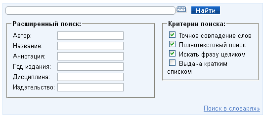 Например, при поиске книг по маркетингу – оптимальным вариантом будет внести слово Маркетинг в окошки меню: «Название»; «Дисциплина» и убрать при этом все(!) отметки (галочки) из раздела «Критерии поиска» - в этом случае поисковая система выдаст все книги данной тематики, не производя полнотекстовый поиск по всей библиотеке и не перегружая данными результаты поиска. При внесении в «Расширенный поиск» словосочетаний, группы слов (когда пользователь хочет видеть все издания интересующей его тематики, а не ищет конкретное издание, название которого он т очн о знает (!)) – целесообразно поставить в графе «Критерии поиска» отметку (галочку) только в пункт «Искать группу слов». В этом случае, результаты поиска так же будут наиболее оптимальные, при этом, поисковая система выдаст произведения, содержащие именно данное словосочетание, или группу слов – в различных падежах и склонениях.