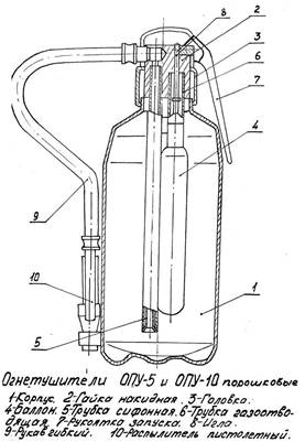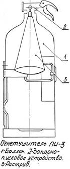 · Со встроенным источником давления. Принцип действия – при срабатывании запорно-пускового устройства прокалывается заглушка баллона с рабочим газом. Газ по трубке подвода поступает в нижнюю часть корпуса огнетушителя и создает избыточное давление. Порошок вытесняется по сифонной трубке в шланг к стволу. Нажимая на курок ствола, можно подавать порошок порциями. Порошок, попадая на горящее вещество изолирует его от кислорода воздуха. · Огнетушители закачного типа (заряд порошка уже под давлением), отличается от предыдущего типа наличием манометра. Принцип действия – рабочий газ закачивают непосредственно в корпус огнетушителя. При срабатывании запорно-пускового устройства порошок вытесняется газом по сифонной трубке в шланг, к стволу насадки или в сопла. Приведение в действие огнетушителя с газовым источником давления: 1 – сорвать пломбу, 2 – выдернуть чеку, 3 – поднять рычаг запорно-пускового устройства до отказа, 4 – направить ствол-насадку на очаг пожара, 5 – через 5 секунд приступить к тушению пожара, подавая порциями заряд порошка, нажимая на курок. Приведение в действие закачного огнетушителя: 1 – направить сопло или ствол-насадку на очаг пожара, 2 – сорвать пломбу, 3 – выдернуть чеку, 4 – нажать на рычаг ЗПУ и приступить к тушению пожара. 2) огнетушитель порошковый самосрабатывающий (ОСП). Предназначен для тушения малых возгораний. Представляет из себя стеклянную колбу, запаянную с обеих сторон. Внутри колбы размещается заряд порошка и инициирующее вещество. Местом установки служит распределительный шкаф служебного отделения. Масса огнетушителя – 1кг, гарантийный срок – 5 лет, размеры 440*40мм. На пассажирском вагоне устанавливается ОСП-1, порог срабатывания которого по температуре 100 градусов Цельсия. Если электрощит не разделен на две части, то эксплуатируется один ОСП, а если разделен на 2 части, то в каждой части должно быть по ОСП.