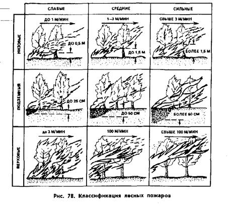 Существуют активные и пассивные методы борьбы с лесными пожарами. При активном методе непосредственно или косвенно воздействуют на кромку пожара. Непосредственное тушение заключается в сбивании пламени водой или водными растворами, захлестывании и засыпке грунтом, косвенное — отжиге. Пассивный метод основан на остановке пожара подготовленной или существующей преградой: минерализованной полосой, рекой, дорогой, противопожарным разрывом и т.д. Предпочтение отдают активным методам борьбы. Во время воздушной или наземной разведки определяют размер очага пожара, рельеф местности, скорость и направление движения огня, места, где он может усилиться (хвойный молодняк, склады лесоматериалов, торфоразработки), препятствия на его пути (дороги, реки, просеки, канавы, поляны, сырые лощины и т.п.). Широкое распространение получили следующие способы тушения лесных пожаров: захлестывание огня по кромке пожара свежесрубленными ветками и вениками, засыпка кромки пожара грунтом с помощью лопат, канавокопателей, экскаваторов, бульдозеров и т.д.; отжиг, тушение кромки пожара водяными струями и водно-солевыми растворами. Перспективен 5%-ный водный раствор бишофита — дешевого природного минерала, в состав которого наряду с другими антипиренами входит хлористый магний. После высыхания раствора на поверхности горючих материалов остается тонкая пленка этого вещества, препятствующая их воспламенению. Однако водный раствор бишофита корродирует металл, что препятствует его применению в качестве огнетушащего вещества. В зависимости от сил, средств и способа тушения выбирают тактический прием борьбы. Низовые лесные пожары тушат захлестыванием огня ветками и забрасыванием пламени землей, а также водой и химическими огнетушащими веществами. Хороший эффект дает выжигание лесной подстилки и создание заградительных полос. Отжиг — выжигание напочвенного покрова для остановки или предотвращения пожара. Его можно использовать при всех видах пожаров, кроме почвенных. Его преимущества перед другими способами тушения заключаются в том, что для отжига не надо рубить просеку, слабый огонь не губит древостоя и очень медленно (30—50 м/ч) движется к пожару против ветра. Отжиг начинают от лесной тропы, дороги, ручья, а также от опорной полосы шириной до 2 м, его ведут под наблюдением лиц, участвующих в тушении. Для этого поджигают лесной покров огнеметами, паяльными лампами или факелами. Задача наблюдателей — не допустить перехода огня через заградительную полосу. Ширина выжигаемой полосы должна в 3 раза превышать глубину кромки низового пожара. Чтобы задержать верховой пожар на путях распространения огня, рубят просеки. При выборе места порубки для уменьшения объема работы используют лесные дороги, поля, ручьи. Ширину просеки делают не менее полуторной высоты дерева. Срубленные деревья удаляют в сторону, откуда идет пожар. Противоположную от пожара сторону тщательно очищают от хлама, валежника, порубочных остатков и другого горючего материала. При приближении огня поджигают сложенные в кучу хворост, порубочные остатки, в сторону пожара начинает двигаться воздух, что способствует сближению встречного огня с основным пожаром. Существует мнение, что до тех пор пока не будет ощущаться тяга в сторону пожара, пускать встречный огонь не следует. При пуске 