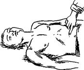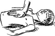 В том месте, где Вы почувствуете сопротивление, положите три пальца на грудную кость: точка нажима находится в нижней трети грудины на три пальца выше найденного Вами отростка грудины. Сначала можно попытаться восстановить сердечную деятельность отрывистым ударом по грудине в найденной точке (рис. 13). Но это не заменяет массажа сердца и не следует делать более одной — двух попыток. Если пульс не появится, приступаем к наружному массажу сердца (если пульс появился, продолжайте искусственное дыхание). Для этого выбираем место нажатия и, располагаясь сбоку от пострадавшего, помещаем ладони рук на выбранный участок таким образом, как показано на рис. 14.