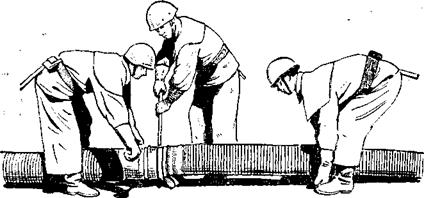 Рис. 52. Соединение всасывающих рукавов насосной станции 72. Установка пожарной насосной станции ПНС-110 на водоем производится расчетом из трех человек — водитель, моторист-дизелист и пожарный. По команде «Пожарную насосную станцию на водоем — ставь» моторист-дизелист включает дизель для прогрева, поднимается на кузов автомобиля, открепляет всасывающую сетку и передает ее пожарному. Пожарный принимает всасывающую сетку, относит ее на 8 метров от насоса в сторону водоисточника и кладет на землю. Водитель снимает лебедку с автомобиля и готовит ее для установки на всасывающий патрубок. Моторист берет растяжки лебедки и закрепляет их за крючки автомобиля. Водитель отвертывает заглушку от всасывающего патрубка насоса, все трое вынимают правый по ходу автомобиля всасывающий рукав. Моторист и пожарный поднимают конец рукава к патрубку насоса, присоединяют его к всасывающему патрубку и завертывают ключом накидную гайку до отказа. Потом снимается второй рукав и укладывается между всасывающей сеткой и первым рукавом. Моторист и пожарный держат рукава, водитель присоединяет накидную гайку одного рукава к штуцеру второго (рис. 52). Далее присоединяется к рукаву всасывающая сетка (моторист держит рукав, пожарный — сетку, водитель соединяет сетку с рукавом). После этого пожарный присоединяет посредине второго всасывающего рукава трос лебедки. При помощи двух рукояток лебедки водитель и моторист поднимают всасывающий рукав и сетку на необходимую высоту для забрасывания в водоем. Водитель подает автомобиль задним ходом к водоему. Моторист и пожарный наблюдают за движением автомобиля и рукавов (рис. 53), а затем при помощи лебедки опускают всасывающую сетку в водоем на глубину не менее одного метра. Водитель включает насос и забирает воду.