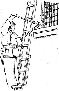 Рис. 81. Вскрытиеподшивки потолка Перегородки из гипсобетонных панелей вскрываются механизированным или ручным инструментом путем вырубания или выпиливания отверстия. 131. Для вскрытия дверей используются ломы, топоры, крюки и механизированный инструмент. Одностворчатые и двустворчатые двери, закрытые на внутренние замки, открывают топором, который вводят в щель вблизи замка и с силой нажимают в сторону до тех пор, пока замок или защелка не выскочит из гнезда. Если дверь закрыта на внутренний засов или замок и ее нельзя открыть указанным способом, в таком случае надо выбить меньшую по размеру филенку двери и открыть засов (замок), Дверь, не имеющую филенок, снимают с петель. Для этого при помощи топора выбивают штифты, соединяющие половинки петель, вводят в щель между косяком и дверью (со стороны петель) лезвие топора и открывают дверь. Если дверь не открывается, ее выбивают с помощью лестницы-палки, вырубают топором или выпиливают пилой отверстие около замка. Для вскрытия висячих замков используют крюки, ломы, топоры, ножницы-кусачки. Прежде всего следует сделать попытку выдернуть пробой. Если это сделать не удается, то в дужку замка или скобы вставляется лом или крюк и срывается замок. Дужка замка может перерезаться ножницами-кусачками. 132. Окно открывается путем ввода острия топора в щель между створками и отводом топорища вправо (влево). Если окно не открывается, необходимо, топором выбить стекло и, соблюдая меры безопасности, открыть затворы, а затем и окно. В рамах с двойным остеклением разбиваются стекла в форточках или в створках, имеющих меньшую площадь остекления, и открываются окна. Решетки снимаются при помощи ломов, кувалды и путем резки ножницами-кусачками. 133. Резку металлических решеток рекомендуется начинать с верхних горизонтальных прутьев, последовательно переходя к нижним прутьям. При этом упором для одной ручки ножниц могут служить нижние прутья. Ножницы устанавливаются так, чтобы их ножи с обеих сторон соприкасались с перерезаемым прутом, одна ручка опиралась в нижние прутья, а основные усилия прилагались ко второй ручке. Вертикальные прутья перерезаются усилием обеих рук. Производить резку металлических решеток на окнах второго (третьего) этажа целесообразно с выдвижной лестницы, установленной в простенке слева от окна. Поднявшись с ножницами по лестнице к окну, нужно выбрать удобное положение и закрепиться карабином. Перерезав верхние горизонтальные прутья, пожарный спускается на несколько ступенек вниз, закрепляется карабином и начинает резать нижние горизонтальные прутья (рис. 82). После этого перерезаются вертикальные прутья в нижней части решетки. Перерезав несколько прутьев, пожарный обеими руками отгибает их, проникает в помещение и оттуда производит окончательное перерезание решетки.