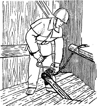 Рис. 83.Работа с электропилой 136. Для работы с электродолбежником необходимо занять устойчивое положение, взяться руками за рукоятки, поставить правую ногу на опорную рамку, включить мотор и убедиться, что цепь и мотор работают нормально. Затем выключить мотор, отрегулировать глубину долбления и закрепить ограничитель. Держа электродолбежник обеими руками за ручку, включить мотор и, нажимая на ручку, продалбливать отверстие в конструкции. В случае попадания цепи на твердый предмет (гвоздь, кирпич и т. п.) немедленно прекратить нажим на долбежник, выключить двигатель и выбрать другое место.