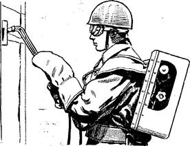 139. Резка электропроводов под напряжением не свыше 220 вт производится по распоряжению командира, который указывает место их перерезания. Для выполнения этой работы пожарный надевает резиновые боты (сапоги) и резиновые перчатки, встает на резиновый коврик, берет ножницы и производит перерезание электропроводов. Если провода подвешены на столбах или на стойках, нужно подняться по выдвижной лестнице, установленной около столба. Положить коврик на ступеньку лестницы, встать на него и закрепиться карабином за ступеньку лестницы (при работе с металлических лестниц между карабином и лестницей должна находиться изолирующая прокладка). Перерезание следует начинать с нижних проводов с таким расчетом, чтобы провода, находящиеся под напряжением, остались закрепленными на изоляторах и не могли соединяться между собой или с какими-либо посторонними предметами. 140. Вскрытие обшивки корпуса самолета производится электрическими или бензомоторными пилами с корундовыми дисками. Обшивку разрешается вскрывать там, где отсутствуют трубопроводы, электрокабели и другие системы. При вскрытии наружной обшивки самолета с наветренной стороны делается разрез по величине двери или аварийного люка. Отрезанная обшивка отгибается баграми, затем убирается утеплитель и с помощью механизированного инструмента вскрывается внутренняя обшивка самолета.