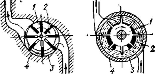 б: 1— ротор; 2 — объем между лопатками; 3 — водяное кольцо; 4 — корпус.