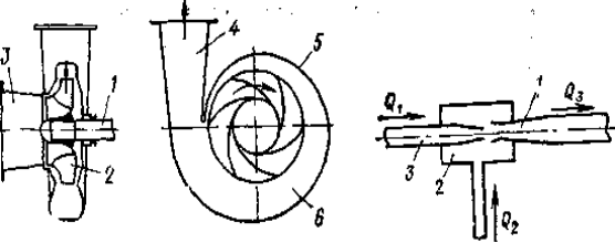 Рис. 5.5. Схемы пожарных насосов: а - центробежного 1 — вал; 2 — рабочее колесо: 3 — всасывающий патрубок; 4 — напорный патрубок; 5 — корпус; 6 — спиральная камера; б – струйного: 1 — диффузор; 2 — камера; 3 — насадок.