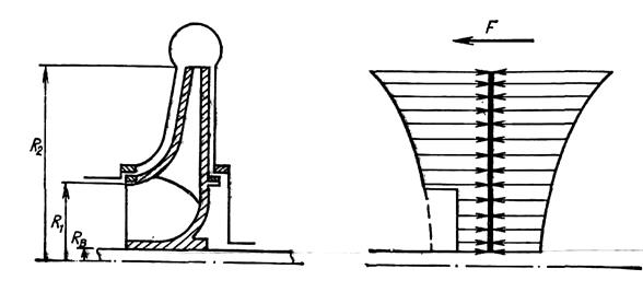 Осевая сила возникает за счет разности давлений на рабочее колесо (рис. 5.6), так как со стороны всасывающего патрубка на него действует меньшая сила давления, чем справа. Величину осевой силы приближенно определяют по формуле