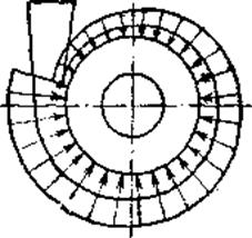 Рис. 5.7. Рабочее колесо пожарного насоса 1 — рабочее колесо; 2 — элементы щелевых уплотнений; 3 — отверстия в ведущем диске; 4 — корпус насоса. Для уменьшения осевых сил, действующих на рабочее колесо насоса, в ведущем диске высверлены отверстия, через которые жидкость перетекает из правой части в левую (рис. 5.7). При этом величина утечек равняется утечкам через целевое уплотнение за колесом, КПД насоса снижается. С износом элементов целевых уплотнений будет увеличиваться утечка жидкости и уменьшаться КПД насоса. В двух- и многоступенчатых насосах рабочие колеса на одном валу могут размещаться с противоположным направлением входа — это также компенсирует или снижает действие осевых сил. Кроме осевых сил на рабочее колесо при эксплуатации насоса действуют радиальные силы. Эпюра радиальных сил, действующих на рабочее колесо насоса с одним отводом, показана на рис. 5.8. Из рисунка видно, что на рабочее колесо и вал насоса при вращении действует неравномерно распределенная нагрузка. В современных пожарных насосах разгрузка вала и рабочего колеса от действия радиальных сил осуществляется путем изменения конструкций отводов. Отводы в большинстве пожарных насосов спирального типа.