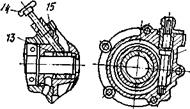На диффузоре корпуса насоса расположен коллектор (алюминиевый сплав АЛ-9), к которому прикреплены пеносмеситель и две задвижки. Внутри коллектора смонтирована напорная задвижка для подачи воды в цистерну (рис. 5.13). В корпусе коллектора предусмотрены отверстия для подсоединения вакуумного клапана, трубопровода к змеевику системы дополнительного охлаждения двигателя и отверстие с резьбой для установки манометра. Напорные задвижки прикреплены шпильками к напорному коллектору. Клапан 1 отлит из серого чугуна (СЧ 15-32) и имеет проушину для стальной 1СтЗ) оси 2, концы которой установлены в пазы корпуса 3 из алюминиевого сплава АЛ-9. К клапану винтами и стальным диском прикреплена резиновая прокладка. Клапан закрывает проходное отверстие под действием собственной массы. Шпиндель 4 прижимает клапан к седлу или ограничивает его ход, если он открывается напором воды из пожарного насоса.