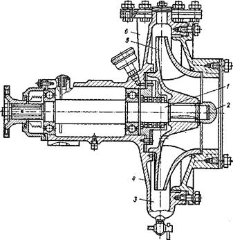Рис. 5.14. Пожарный насос ПН-60: 1 — вал; 2 — гайка; 3 — спиральная камера; 4 — корпус; 5 — рабочее колесо; 6 — диффузор.