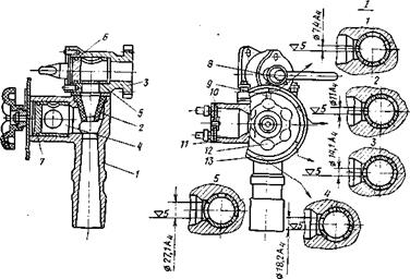 Рис. 5.27. Пеносмеситель ПС-5: 1— корпус; 2 — дозатор; 3 — сопло; 4 — пробка крана; 5 — корпус крана; 5, 7— уплотнительные кольца; 8 — ручка; 9 — стрелка; 10 — обратный клапан; 11 — крышка клапана; 12 — маховичок; 13 — шкала; I— положения дозатора
